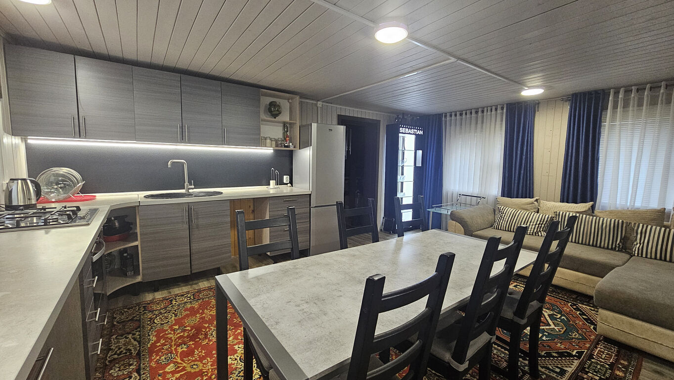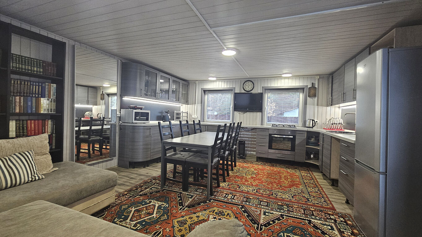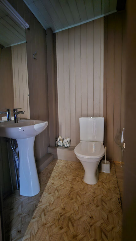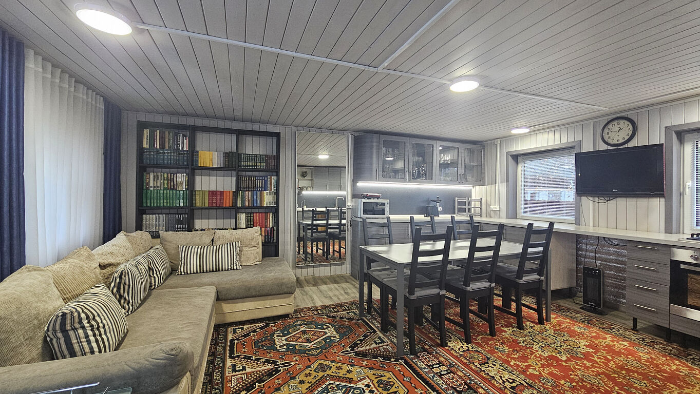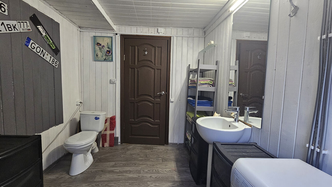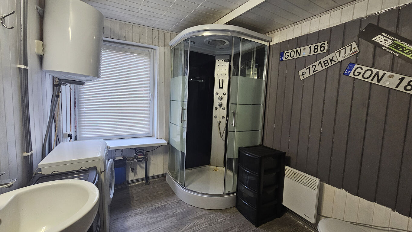 1 этаж: кухня гостиная, сан узел с душевой кабиной, стиральной машинкой;