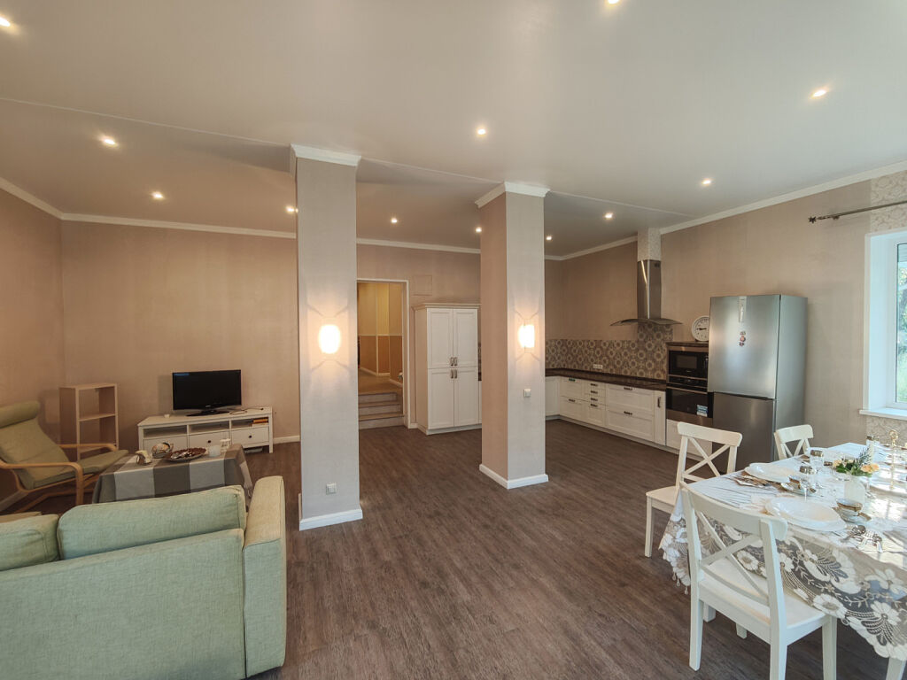 В доме 7 полноценных комнат по 14-15 метров каждая и 5 санузлов, 4 из которых, совмещенные с душевыми и 1 гостевой туалет. Это позволяет комфортно проживать всем членам семьи разного поколения. Дом, в котором никто не мешает друг другу, у всех свое пространство, но при этом есть просторная кухня-гостиная, площадью 58,5 м.кв. для отдыха и проведения праздников.