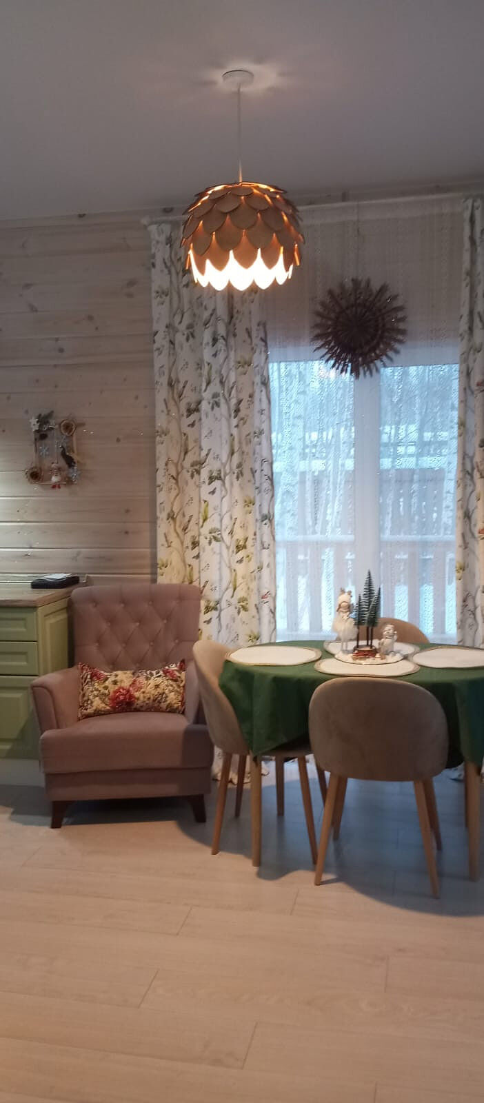· 1 этаж: светлая кухня-гостиная с выходом на террасу, большое крыльцо 8 кв.м, просторная прихожая, удобная гардеробная и санузел.