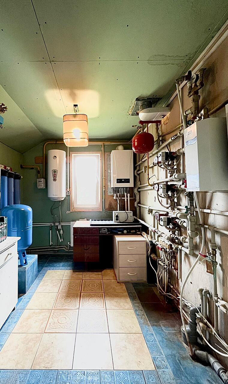 2- этаж: лестница, тамбур, 3 спальни, радиаторы отопления. Отопление и горячая вода: двухконтурный газовый котел Бакси - 24 КВ., дополнительно установлен электрический котел + бойлер ГВС. Система очистки воды.
