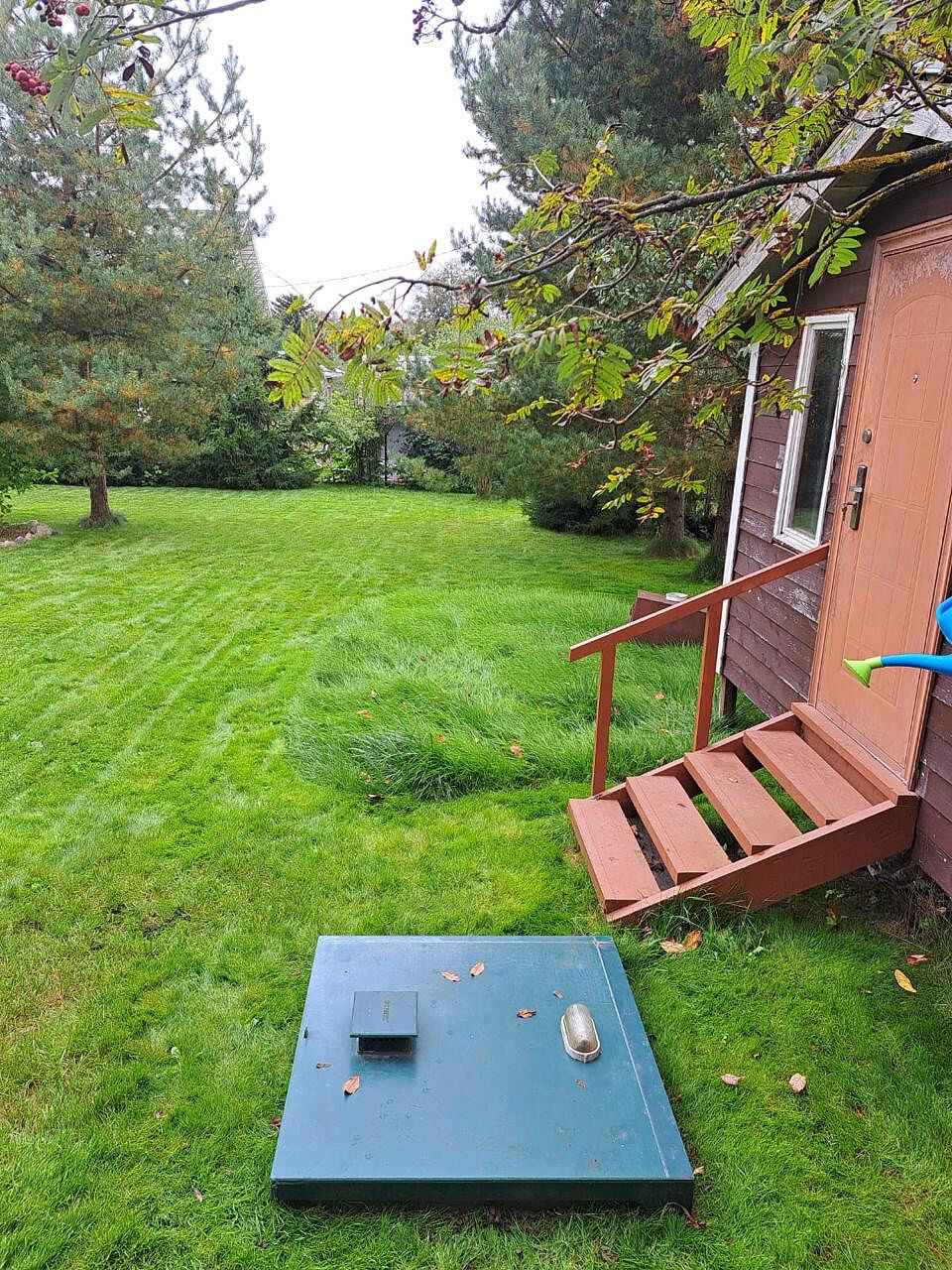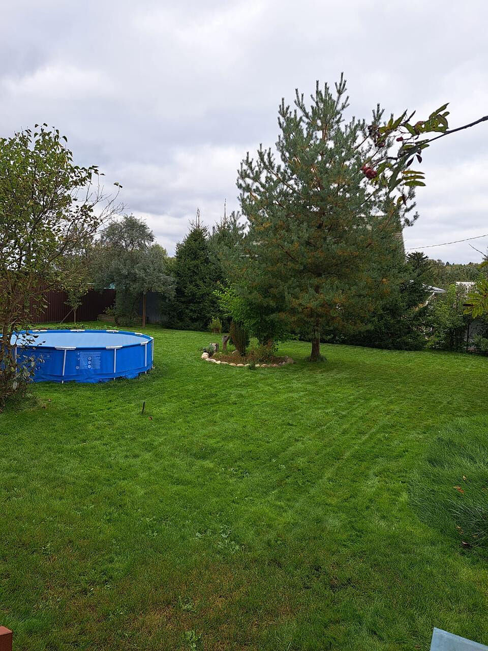 На участке, 8 соток, плодовые деревья и кустарники, цветы, газон, маленький огород ,гараж и хозблок, а также бассейн. Участок ровный ,сухой, правильной формы, ухожен.