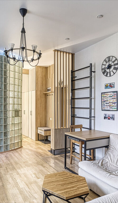 Предлагается к продаже не просто квартира, а готовая к проживанию работа дизайнера. В отделке использованы дерево, камень и другие натуральные материалы. Большая комната грамотно разделена деревянной перегородкой на две функциональные зоны, что создает ощущение просторной студии с приватной спальной территорией.