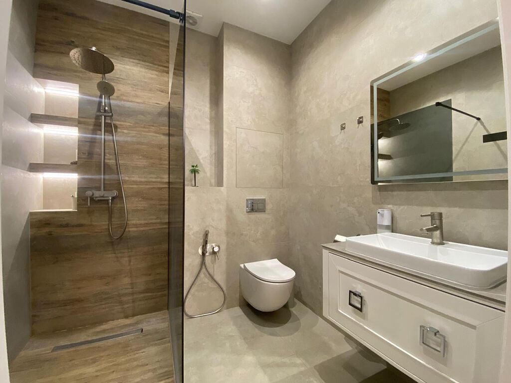 · Современная ванная комната с тёплым полом.