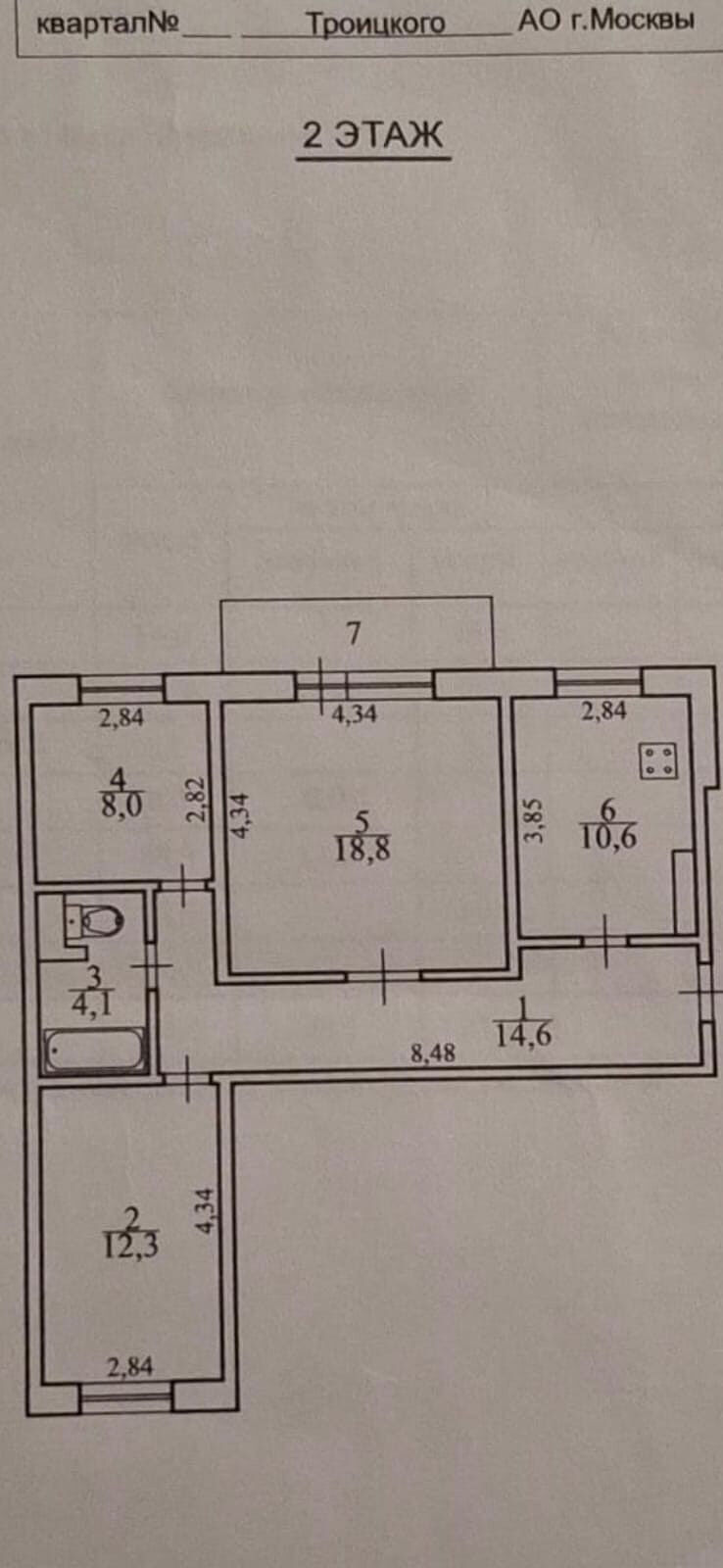 Кухня 10.6 кв.м. комнаты 18.8+12,3+8 кв.м. санузел совместный. в квартире окна комнаты 12.3 кв.м. выходят во двор, все остальные окна на улицу.