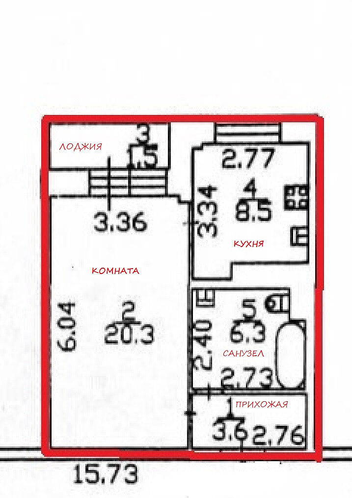 Просторная комната ( 20,3 кв.м.) с проходом в кухню (8,5 кв.м), большой санузел (5,6 кв.м).