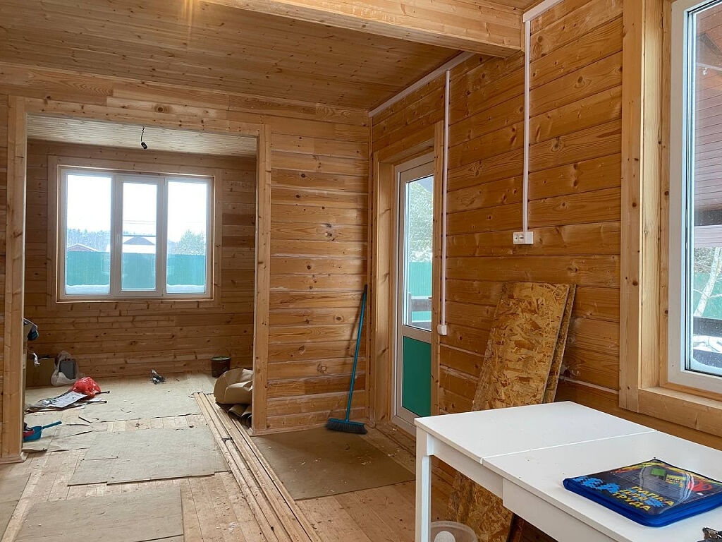 Первый этаж - клееный брус-180 мм, между брусьями утеплитель.