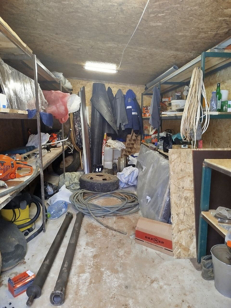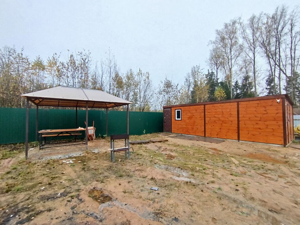 На участке: один навес для авто, один навес для барбекю, бытовка с комнатой отдыха и мастерской.