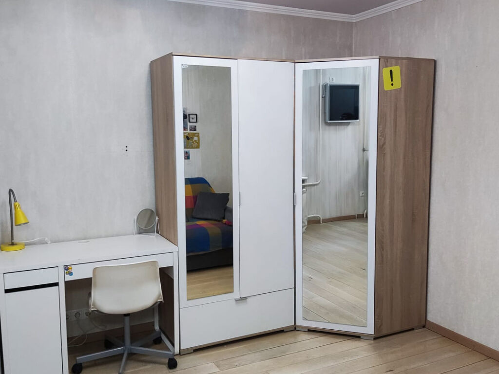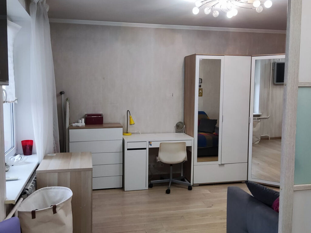 · изолированная комната 9,6 м² и просторная комната 14 м², отделенная от кухни раздвижной перегородкой (возможна студийная зона).