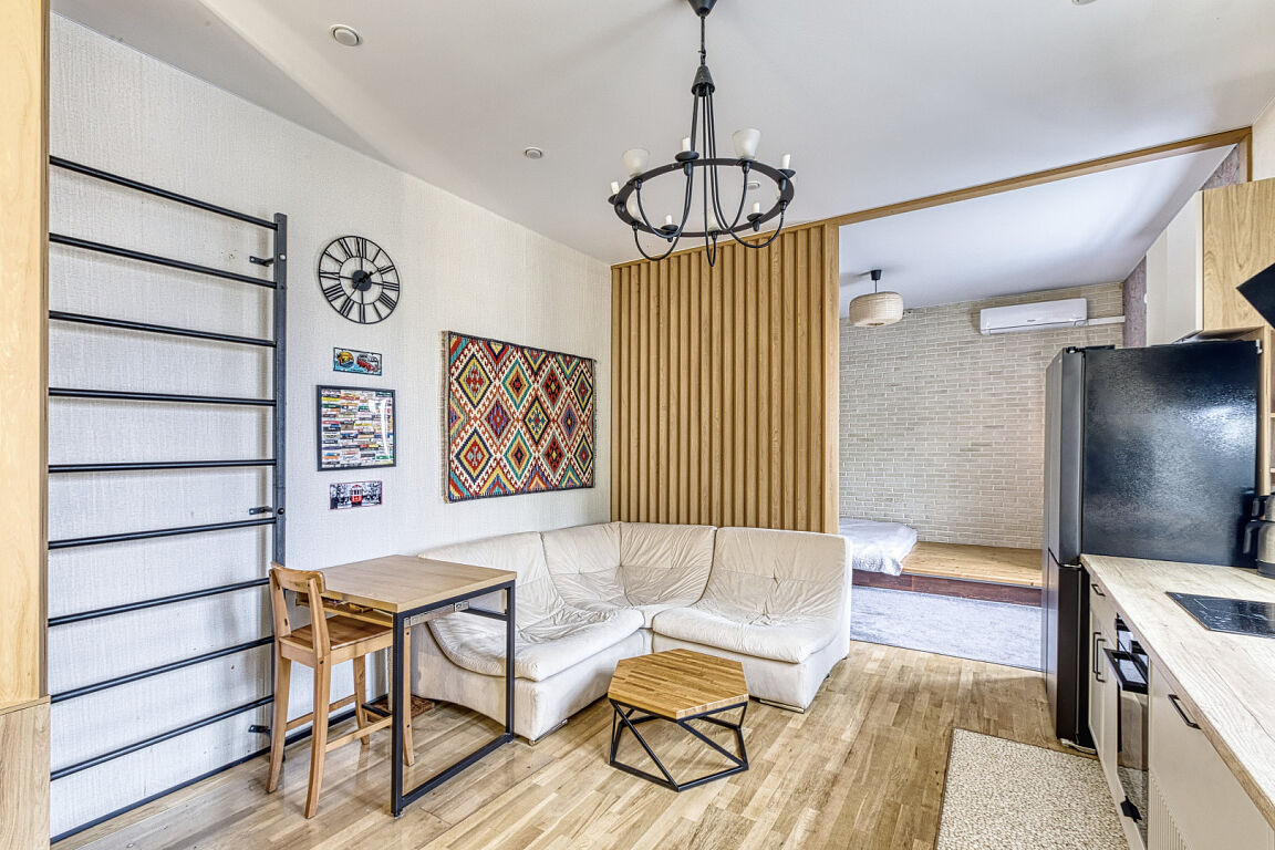 Предлагается к продаже не просто квартира, а готовая к проживанию работа дизайнера. В отделке использованы дерево, камень и другие натуральные материалы. Большая комната грамотно разделена деревянной перегородкой на две функциональные зоны, что создает ощущение просторной студии с приватной спальной территорией.