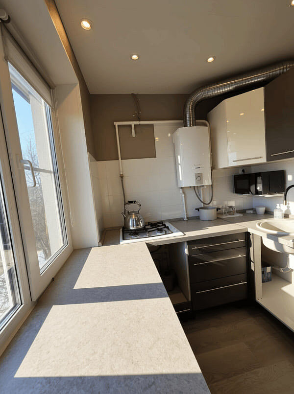 Кухня: гарнитур, большая столешница, мойка из литьевого мрамора, газовая варочная панель Gefest, автоматическая газовая колонка BaltGaz (Neva), подготовка под духовой шкаф и вытяжку.
