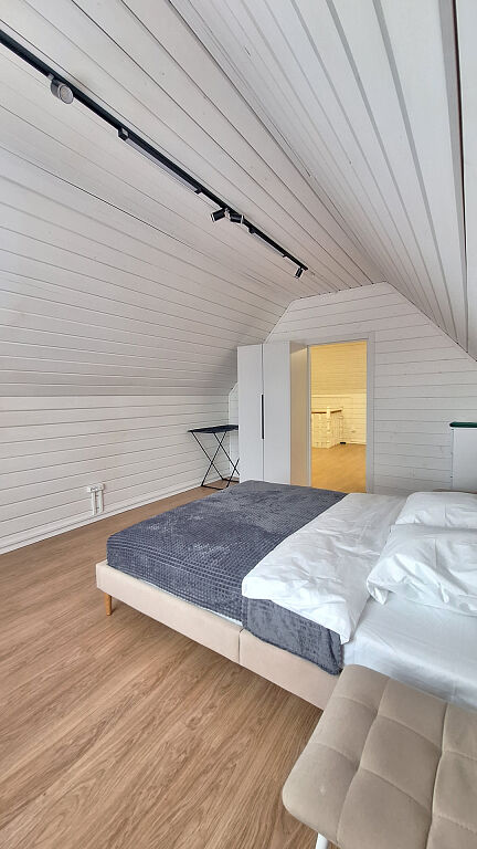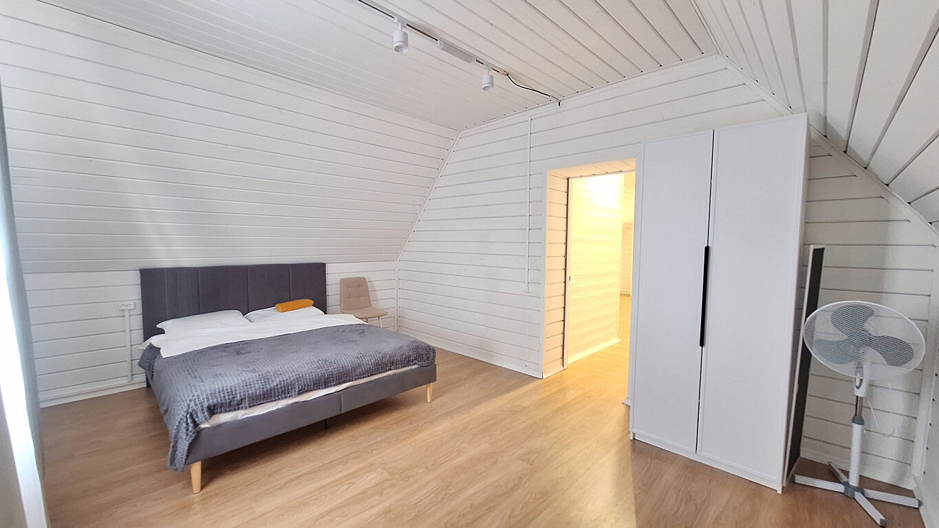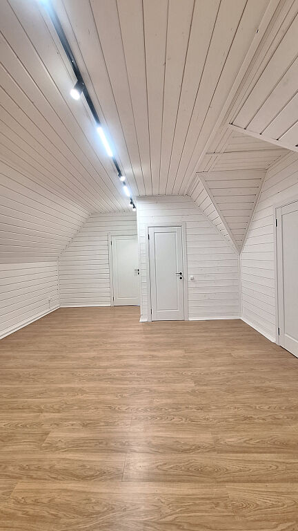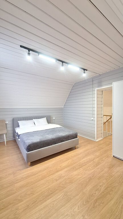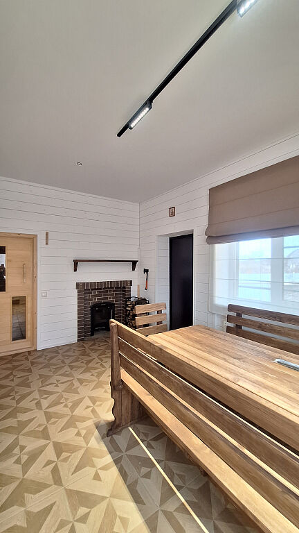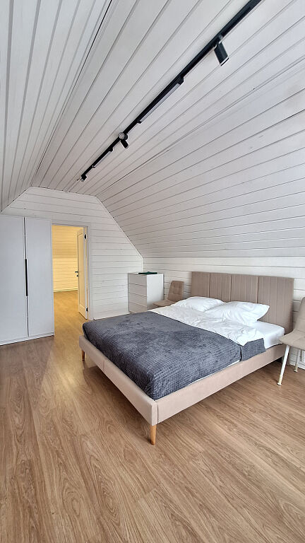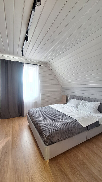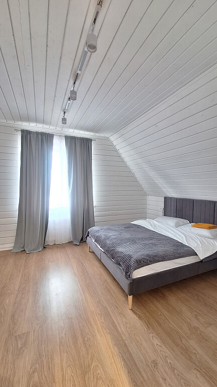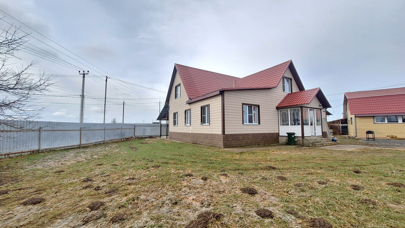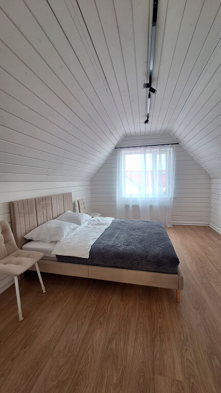 Дом, двухэтажный, с комфортной планировкой (на первом этаже: кухня гостиная, санузел, комната для отдыха, баня, на втором этаже: три изолированные спальни и санузел).