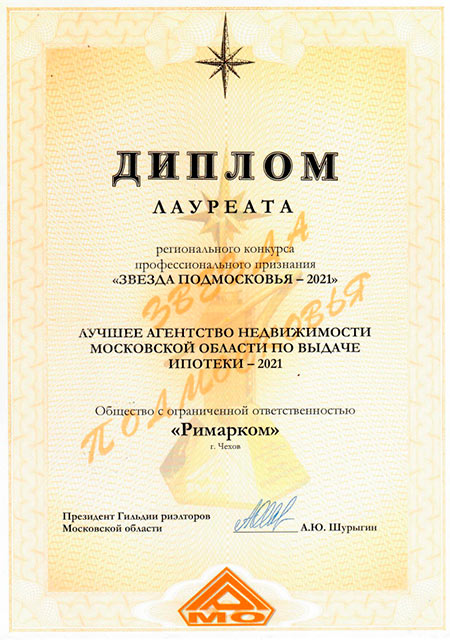 Агентство недвижимости Римарком завоевало звание лауреата в ежегодном конкурсе профессионального признания ГРМО «Звезда Подмосковья» в номинации «Лучшее агентство недвижимости Московской области по выдаче ипотеки – 2021»