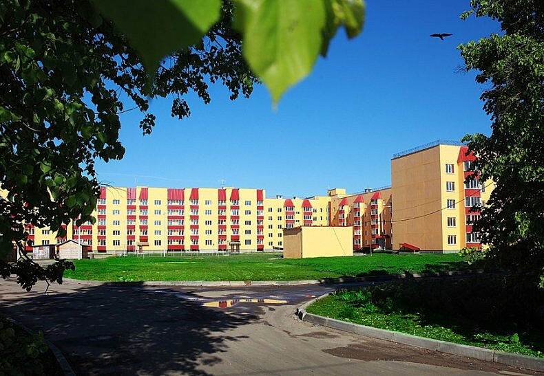 Во дворе детская и спортивная площадки, парковочные места для автомобилей.