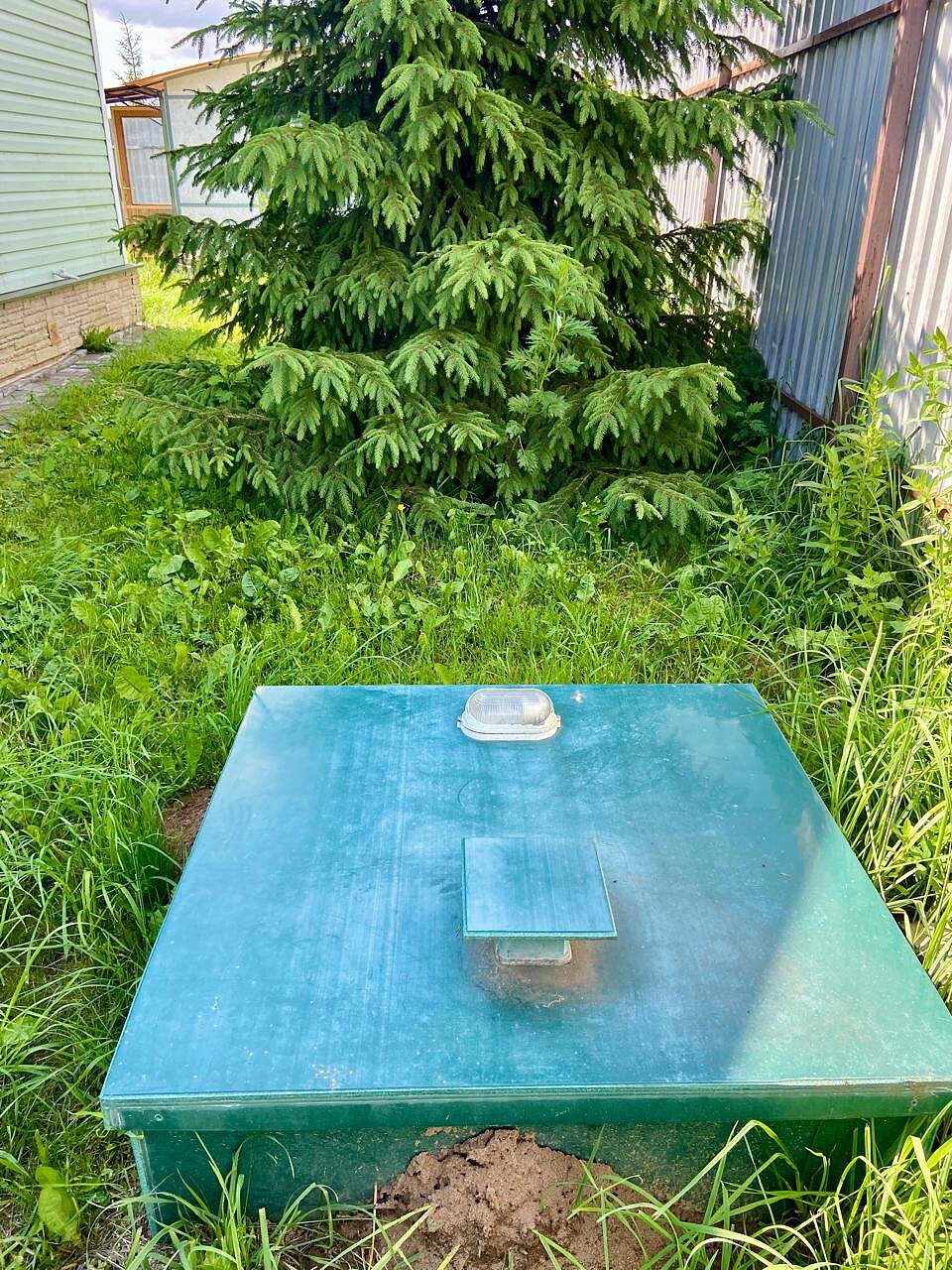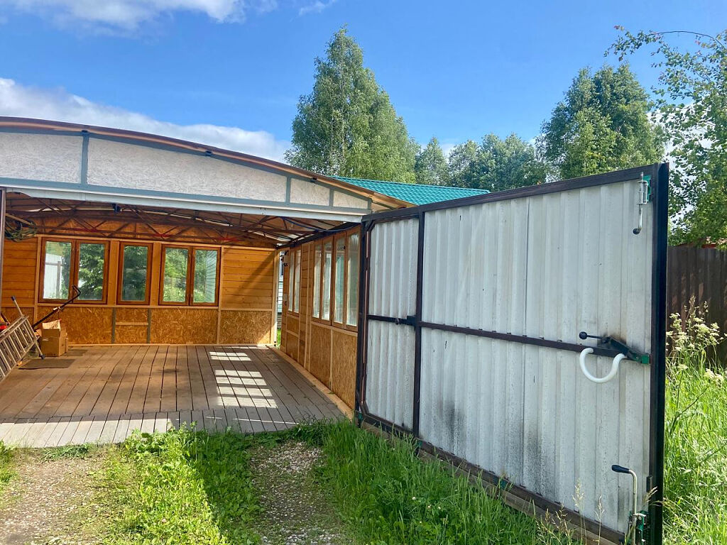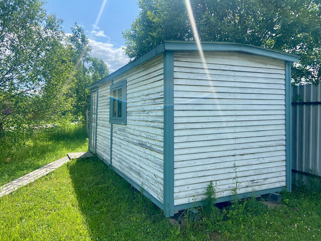 Ровный участок 9 соток, со всех сторон с забором, на участке есть большой гараж, бытовка, дорожки, есть несколько взрослых деревьев.