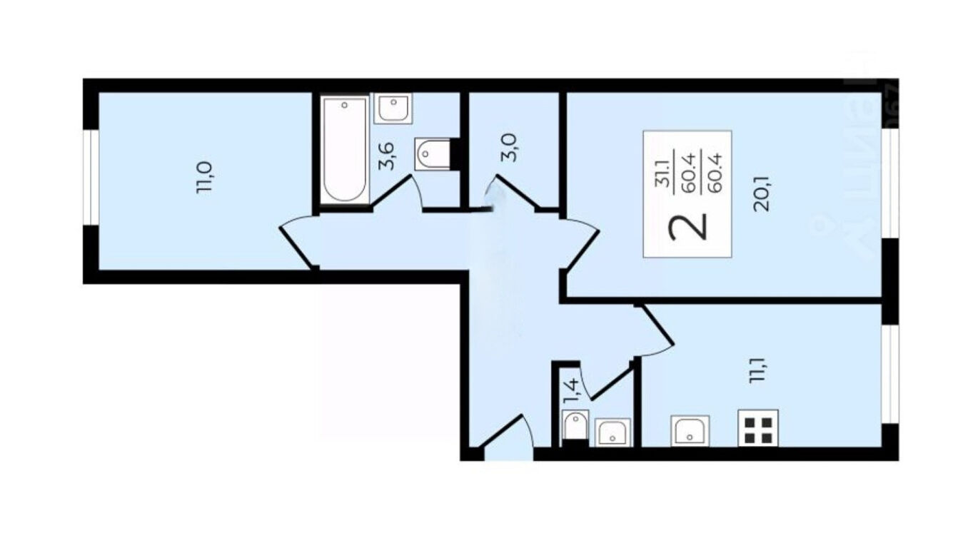 Уникальное предложение: 2-комнатная квартира 60 м² с двумя санузлами в ЖК «Яковлево»