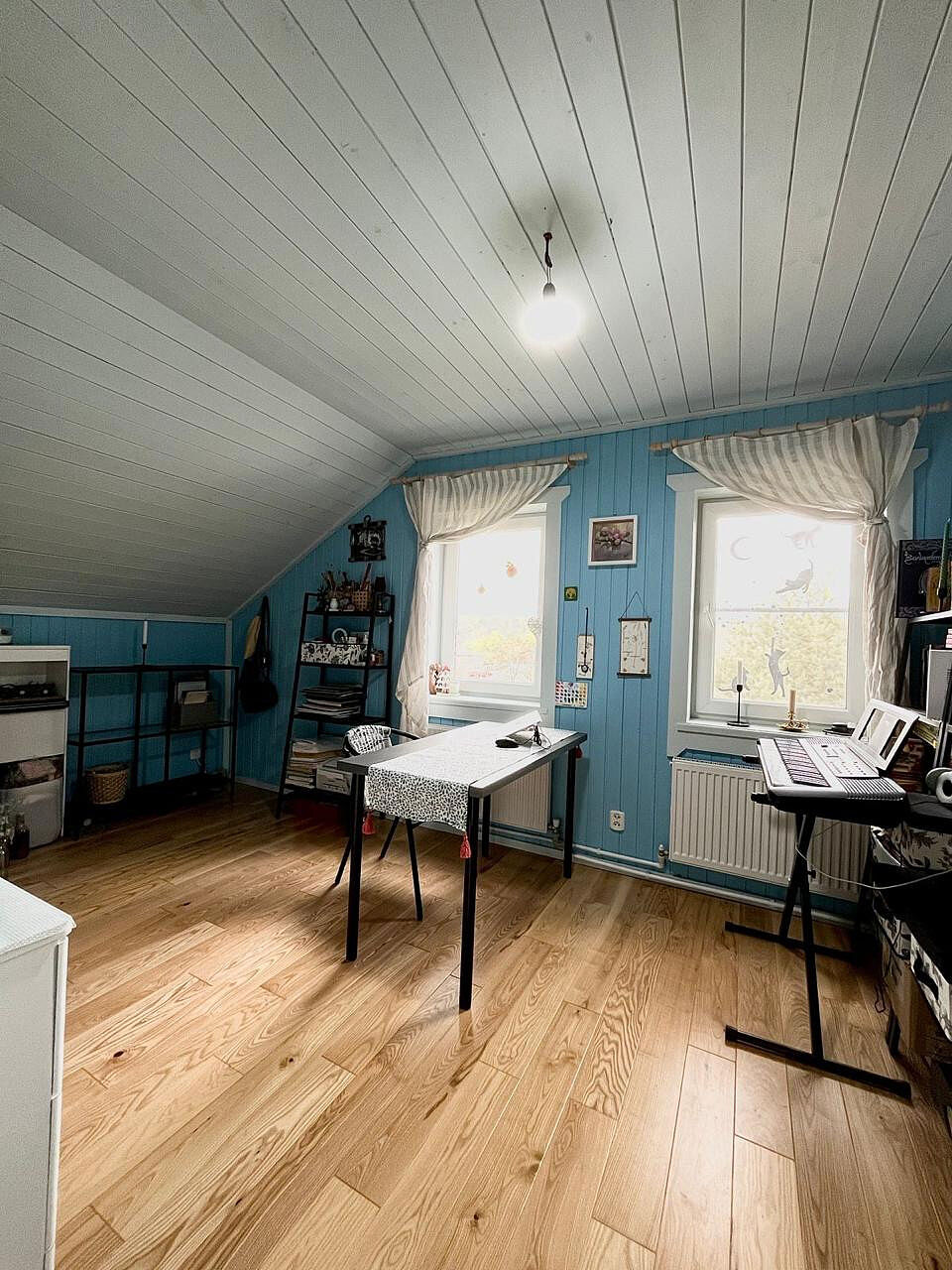 1- этаж: коридор, камин, кухня - столовая, два санузла, комната, котельная, водяные теплые полы, радиаторы отопления.