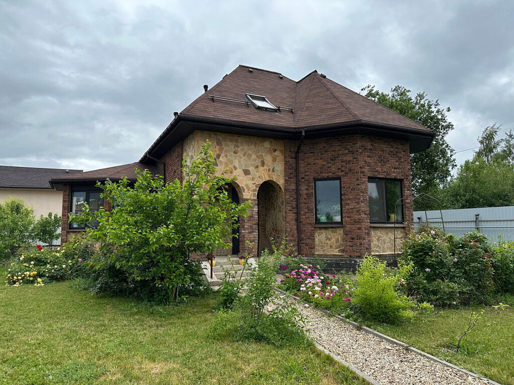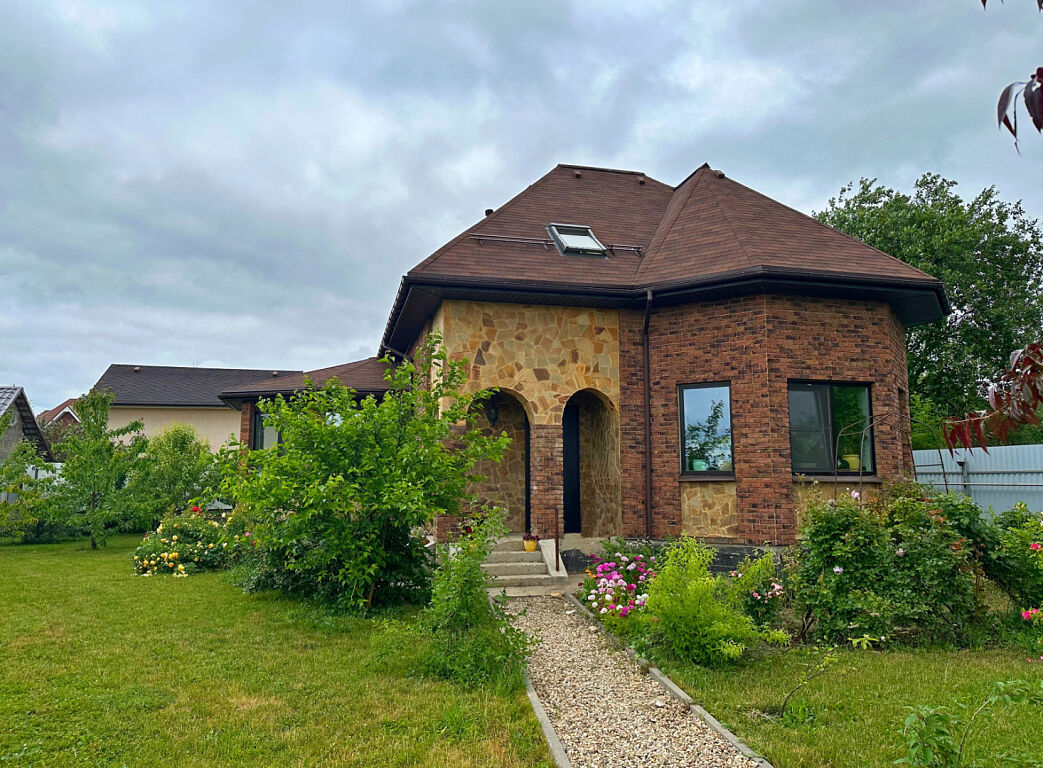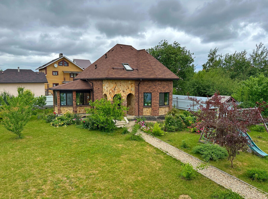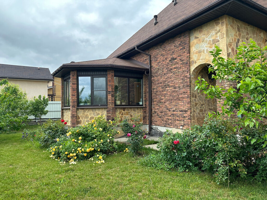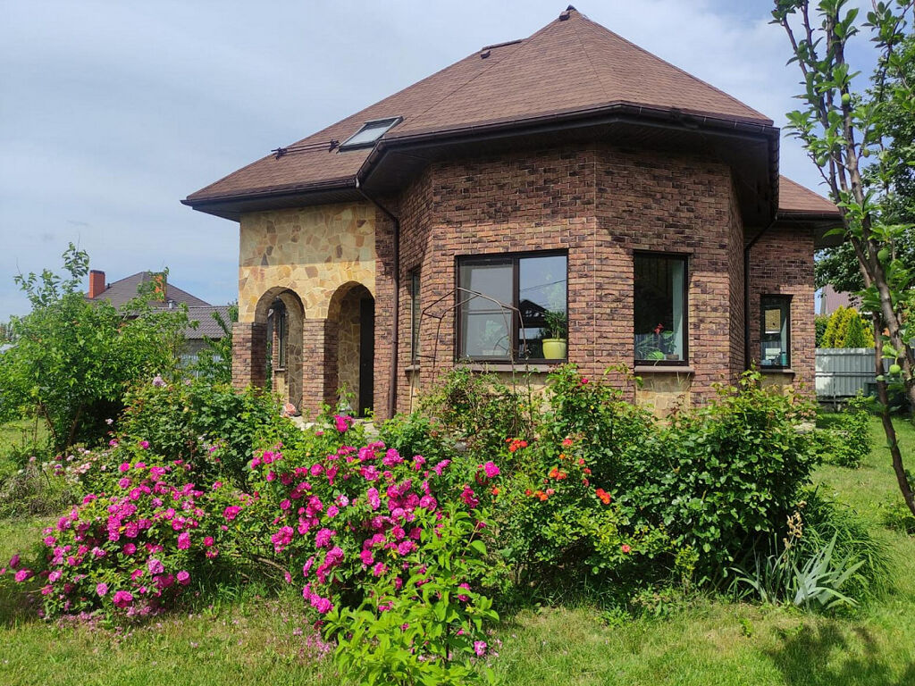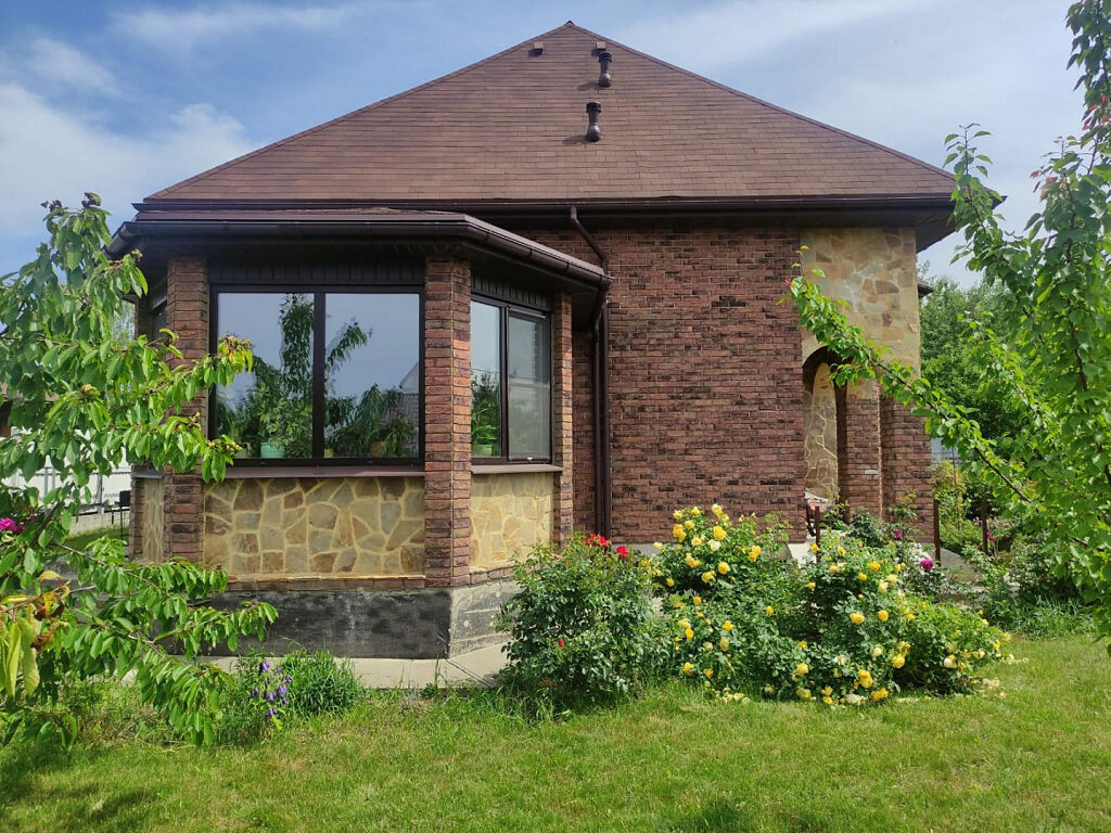 Дом каменный, двухэтажный, из блоков, облицован бельгийским кирпичом ручной работы.