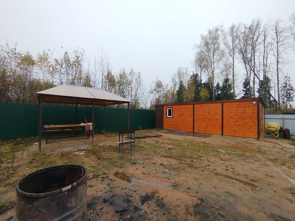 На участке: один навес для авто, один навес для барбекю, бытовка с комнатой отдыха и мастерской.