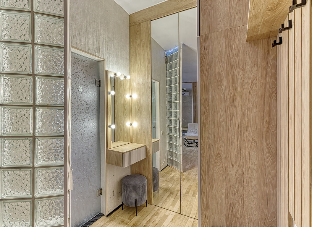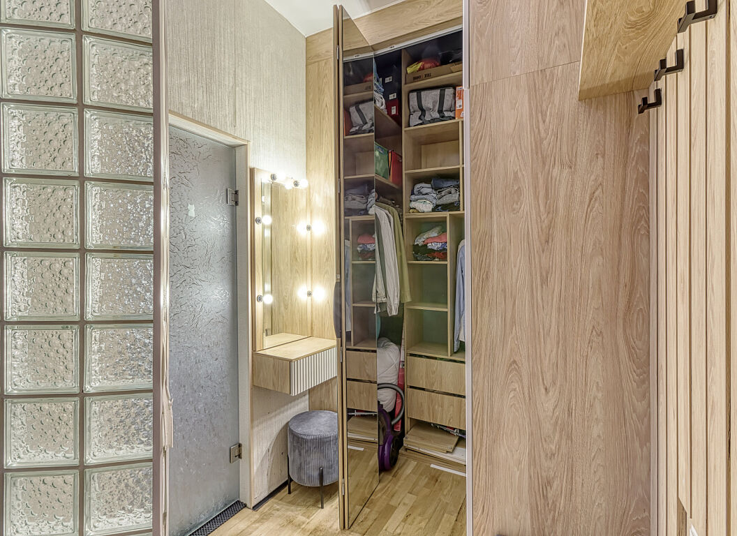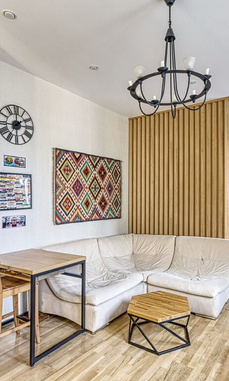 Вся мебель, которая идеально вписана в пространство, изготовлена на заказ и остаётся новому владельцу. Это решение для тех, кто ищет уникальное жильё с характером, не требующее дополнительных вложений.