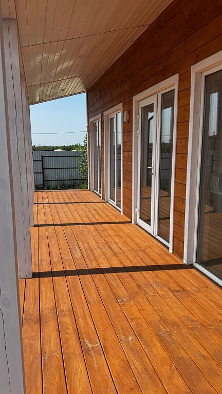 Внутренняя отделка - стены имитация бруса, натяжные потолки, полы ламинат, в санузлах плитка, сантехника, окна 2х камерные стеклопакеты с мульти напылением.