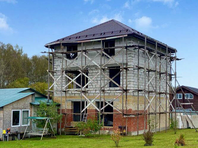 Каменный дом 270 м. кв. выполнен из кирпича (1й этаж) и газоблока (2й и 3й этажи).