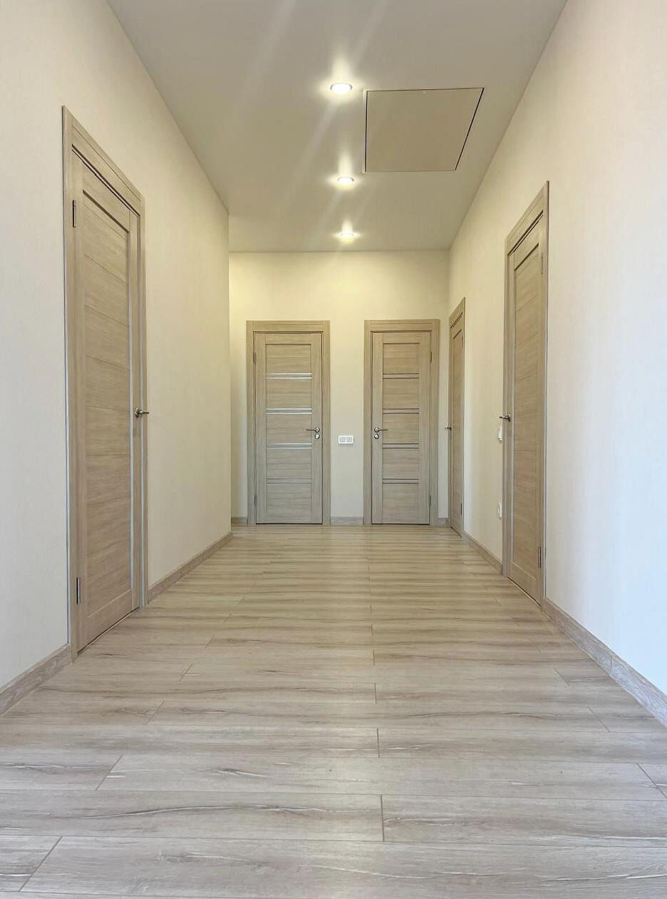 Три изолированные спальни, большая гостиная, совмещенная с кухней, ванная комната, котельная.